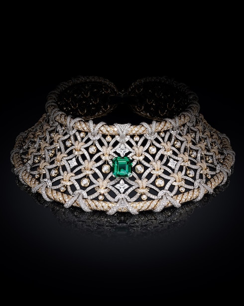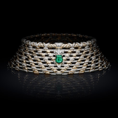 Séduction unveils unprecedented intricacy, celebrating the burgeoning textile and passementerie expertise of the period. Precise details like the V shape, cord-style fringing, and Monogram Kite motif recall the Maison's historic codes, culminating in one of the most impressive necklaces of the collection — featuring an incredible 12.92-carat Zambian emerald, totaling 4,200 hours of work.