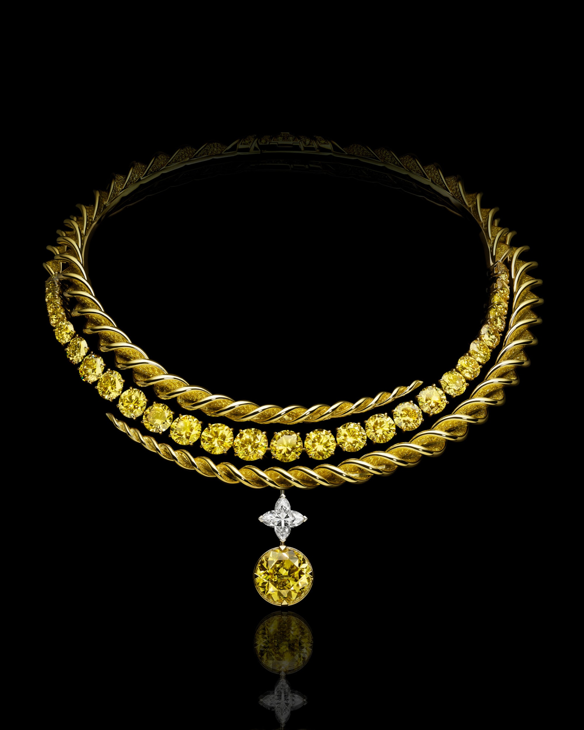 The radiant apex of brilliance, Eternal Sun is a pure, minimalist design — emancipated from all codes, where the creator expresses himself with unrestrained genius, the epilogue of the collection. A golden spiral twists around 27 exquisite yellow diamonds, centered by an exclusive 3.88-carat LV Monogram Star cut diamond and a magnificent 14-carat round yellow diamond, glowing with uninhibited elegance. It fuses mastery and freedom in an endlessly versatile form — a golden apotheosis of light.