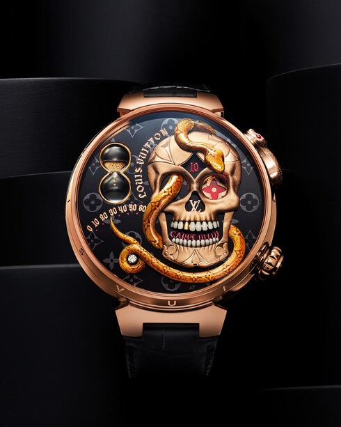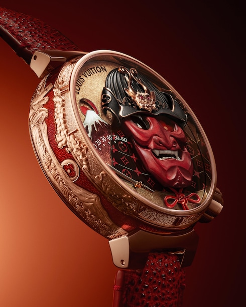 Continuing Louis Vuitton’s High Watchmaking journey, the exceptional Tambour Bushido Automata timepiece pays homage to Japanese art, culture, and history, referencing Bushido, the samurai’s code of conduct. Showcasing the exceptional savoir-faire of the House’s Métiers d’Art, the mask is brought to life with the push of a button – revealing the hours on the helmet while the katana sword indicates the minutes.