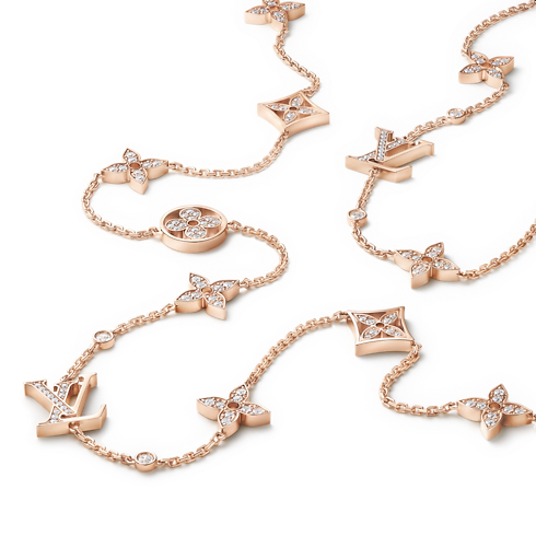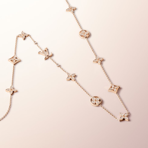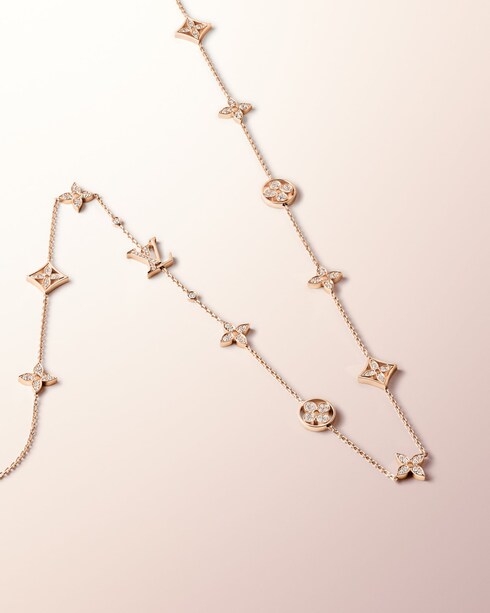 Embodying an effortless femininity, necklaces are either adorned with a diamond-encrusted Louis Vuitton Monogram motif or radiate in their simplicity for a sublime interpretation of the iconic symbol.