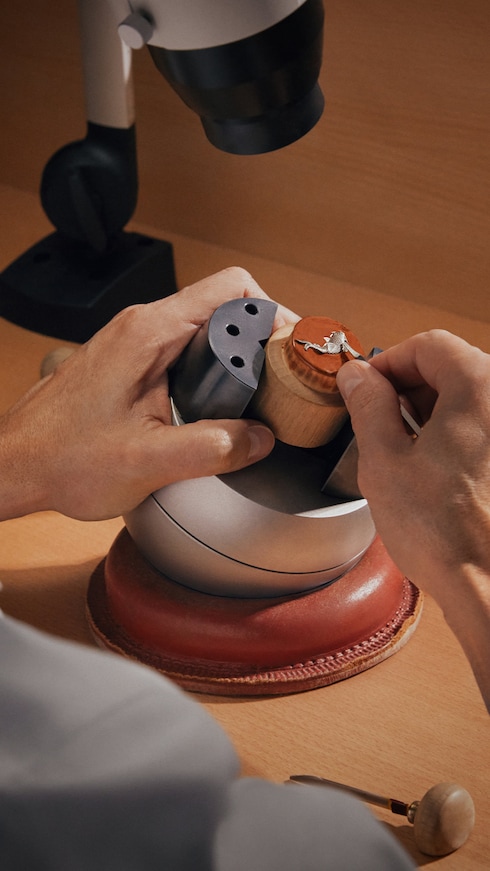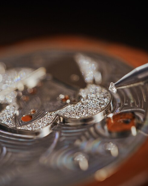 Embellishing bezels, cases, and dials with radiant brilliance, gem-setting adds a touch of preciousness to the Manufacture's creations. The metal is first finely worked by the master jeweler to house the stones, which are then set with immaculate care and artistry by the master gem-setter, using refined methods such as closed, claw, and snow settings to evoke a poetic finish.