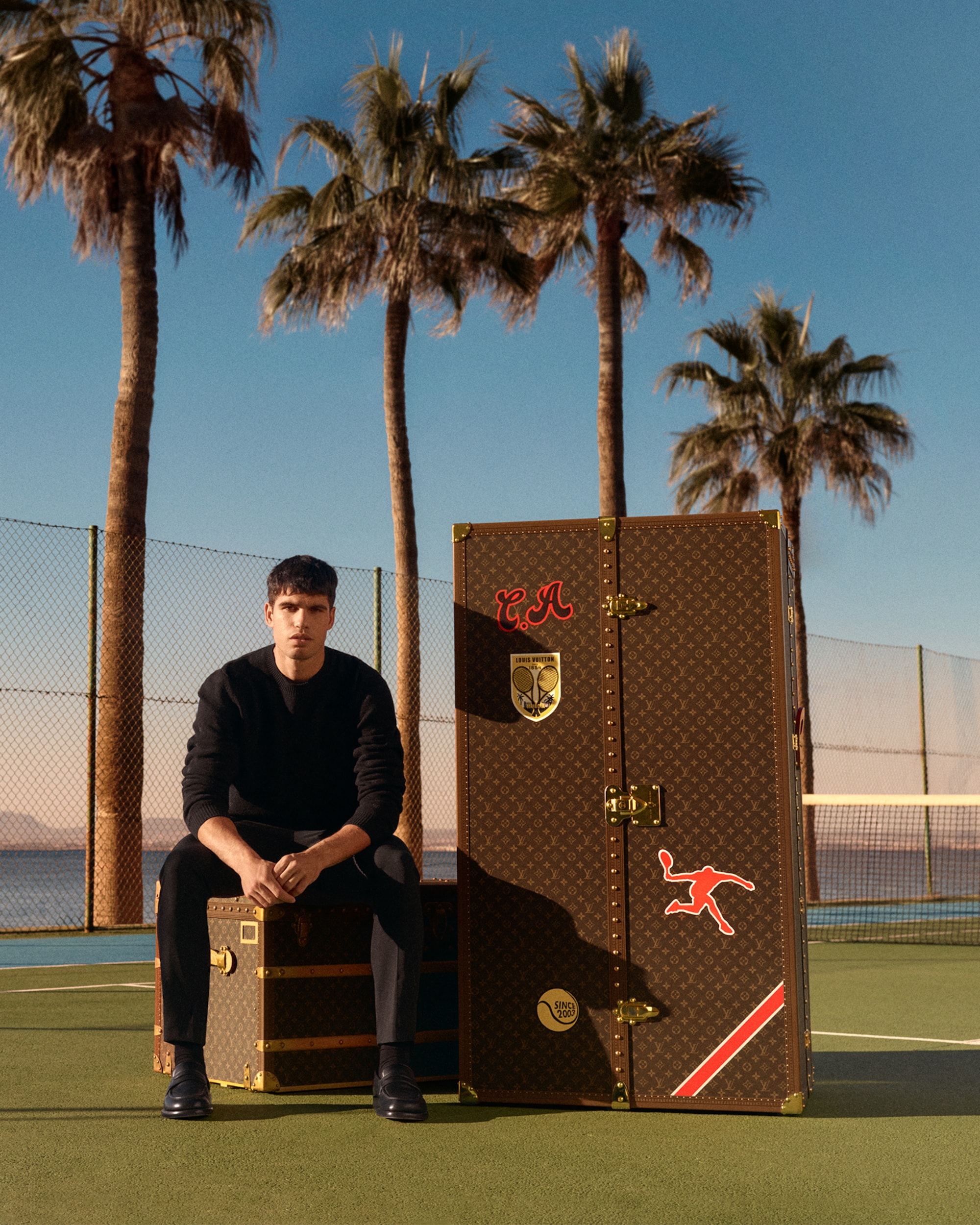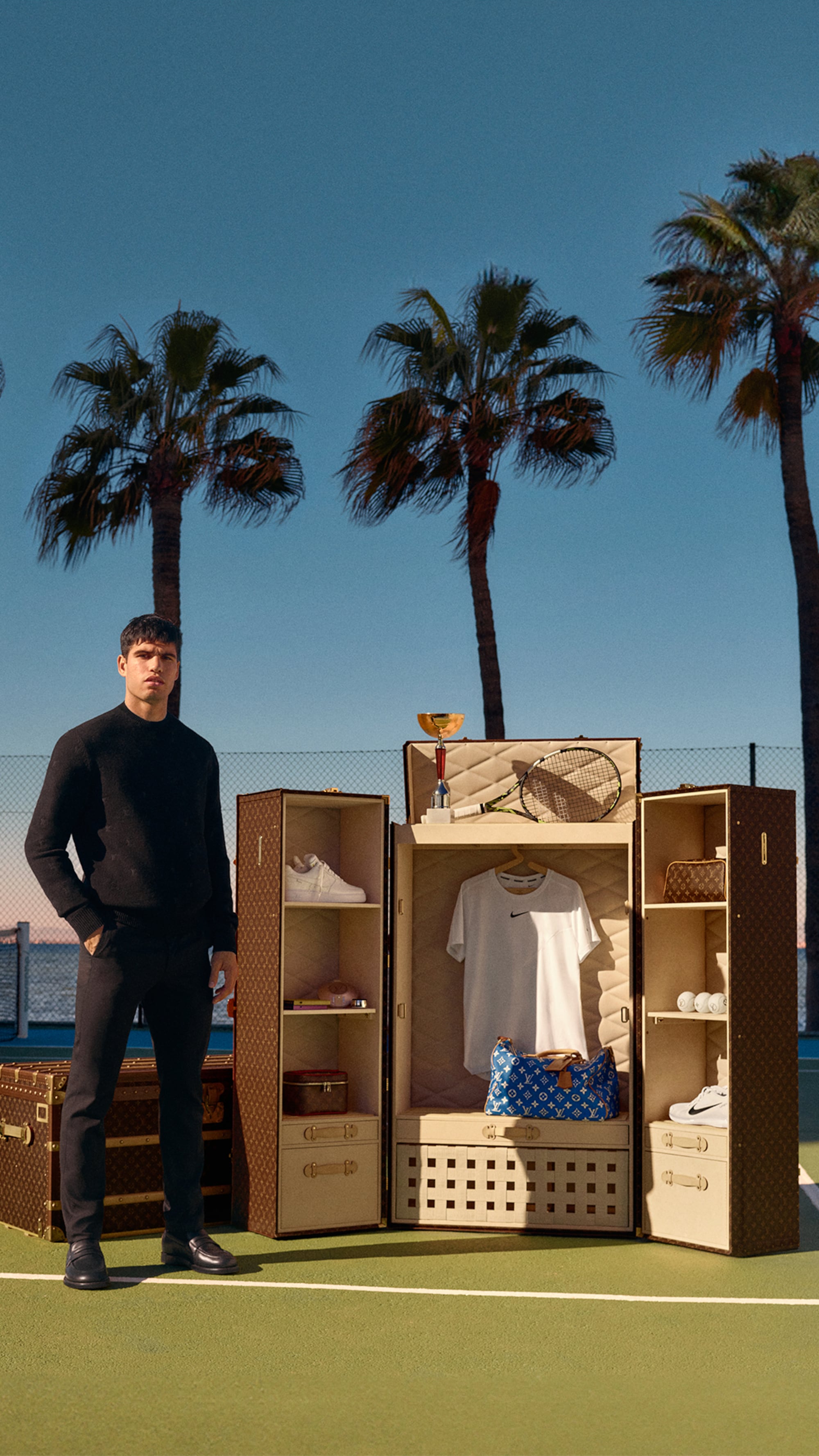 Louis Vuitton collaborates with House Ambassador Carlos Alcaraz, winner of Wimbledon 2023 and the US Open 2022, to create a personalised trunk, honouring the tennis champion's outstanding sports victories.