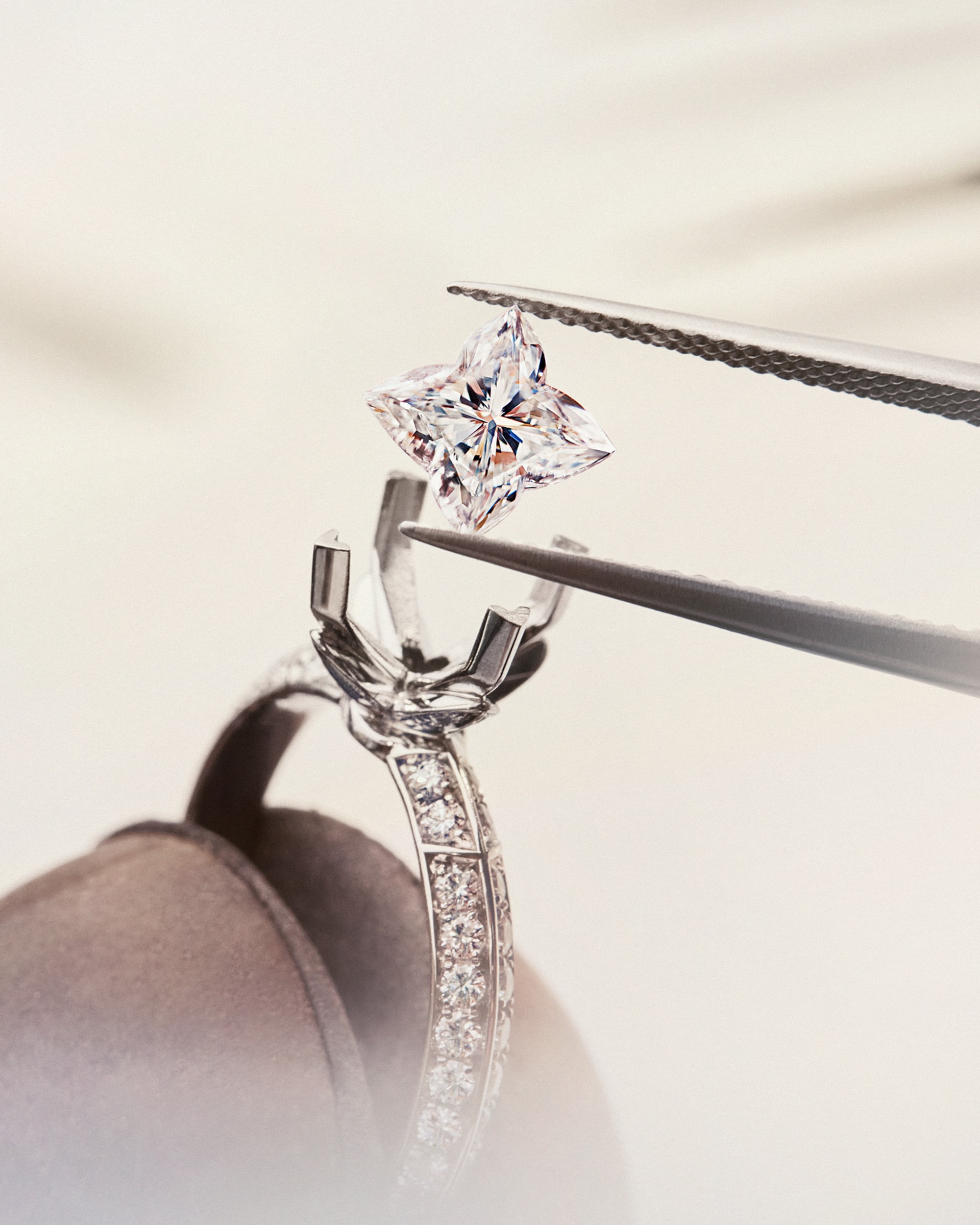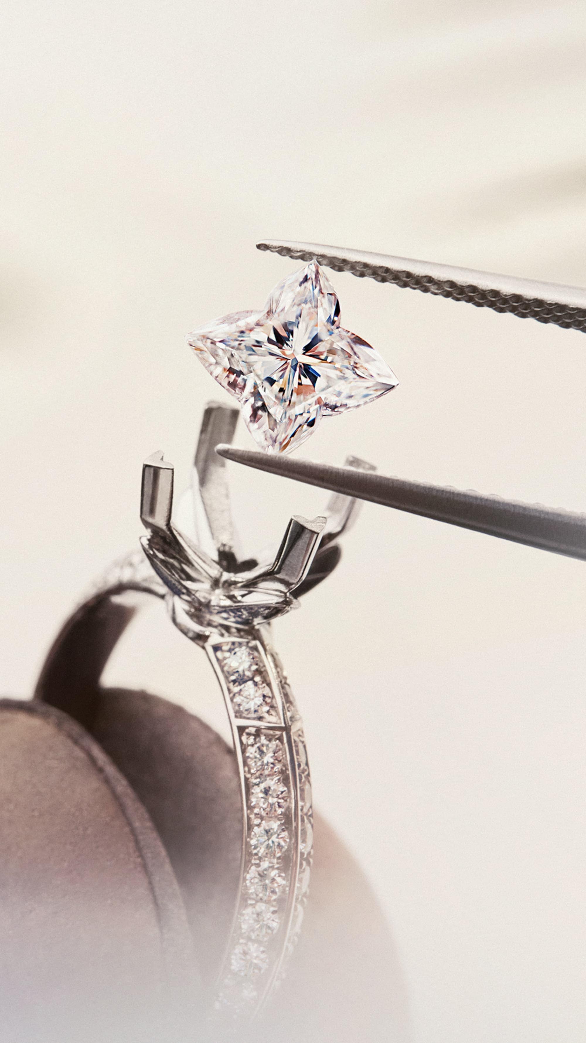 Setiap batu utama dipasang secara manual oleh pengrajin di Prancis atau Italia, yang dengan ketelitian tinggi menghidupkan setiap kreasi LV Diamonds melalui setting yang elegan dan detail—dengan tatah berbentuk V yang lembut atau bezel berbentuk bunga.