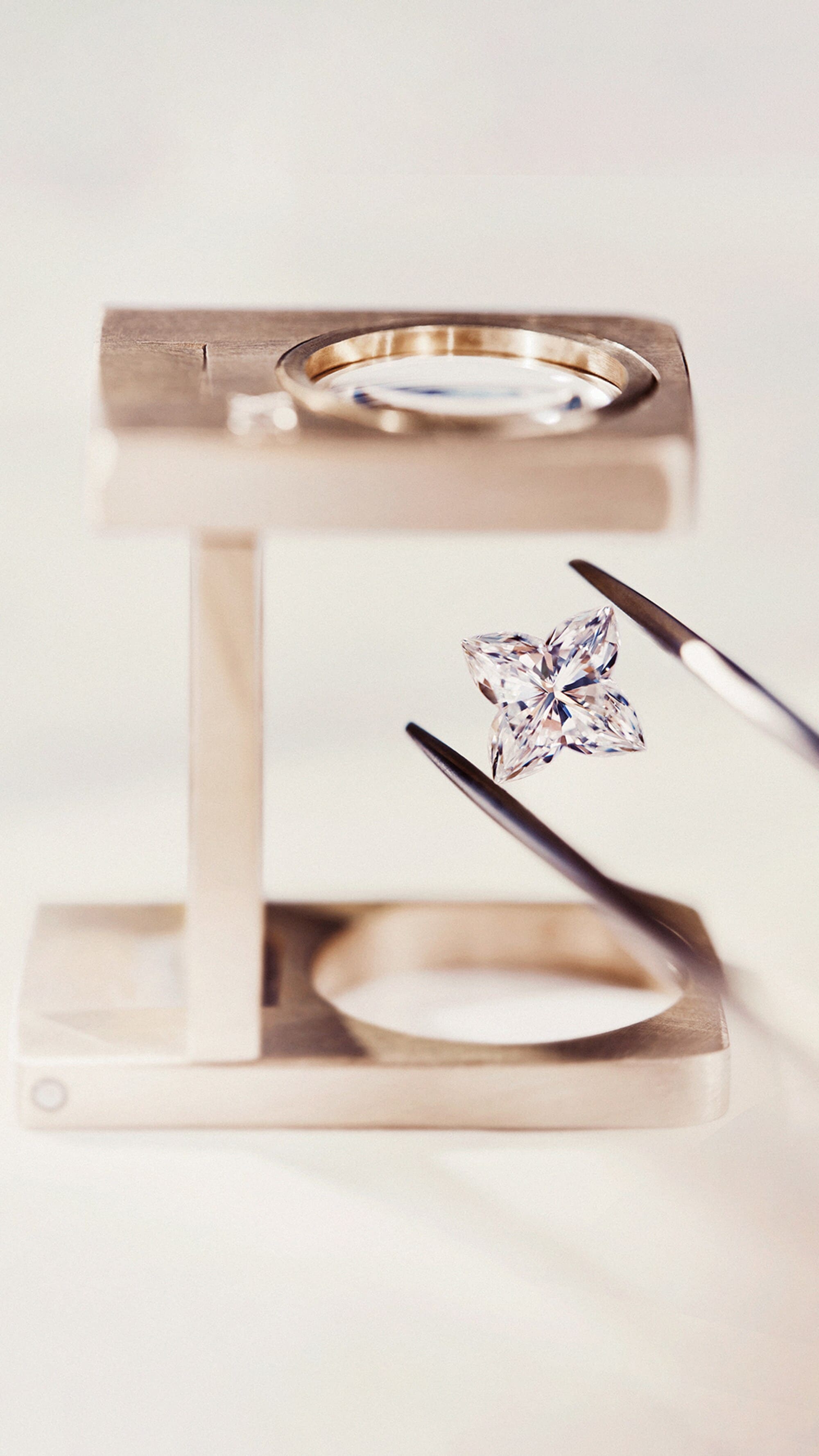 Tim artisan spesialis memotong dan memoles berlian di Belgia atau India, dua pusat permata bersejarah dunia dengan tradisi tak tertandingi dalam menyempurnakan batu mulia. Baik dalam bentuk brilliant cut klasik maupun LV Monogram Star cut yang khas, setiap berlian memerlukan keahlian dan savoir-faire istimewa untuk mencapai bentuk multifaset yang sempurna dan kilau yang memukau.