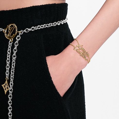 Dibuat dari bahan logam berwarna emas yang berkilau, gelang LV Script menampilkan Louis Vuitton signature baru yang dipamerkan sebagai latar panggung pergelaran busana Spring-Summer 2025. Desain uniknya terdiri dari dua baris rantai halus yang membingkai nama Rumah Mode dalam gaya tulisan yang ramping dan mengalir. Dapat dipakai sendiri atau ditumpuk, gelang ini menambahkan sentuhan glamor yang memikat pada setiap busana.