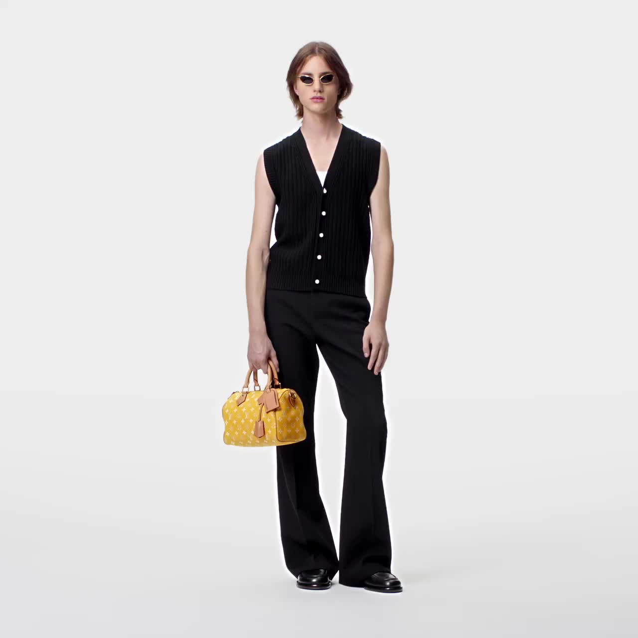 Speedy P9 Bandoulière 25 Monogram Leather menghadirkan kesan sangat mewah dalam balutan material calfskin sangat lembut, disertai cetakan motif Monogram yang menyerupai tampilan Monogram di atas canvas. Kreasi Creative Director Pharrell Williams yang kaya detail tampak pada berbagai bagian tas ini, mulai dari hardware keemasan, lapisan lining dari bahan lambskin, hingga plakat eksklusif di bagian dalam tas.