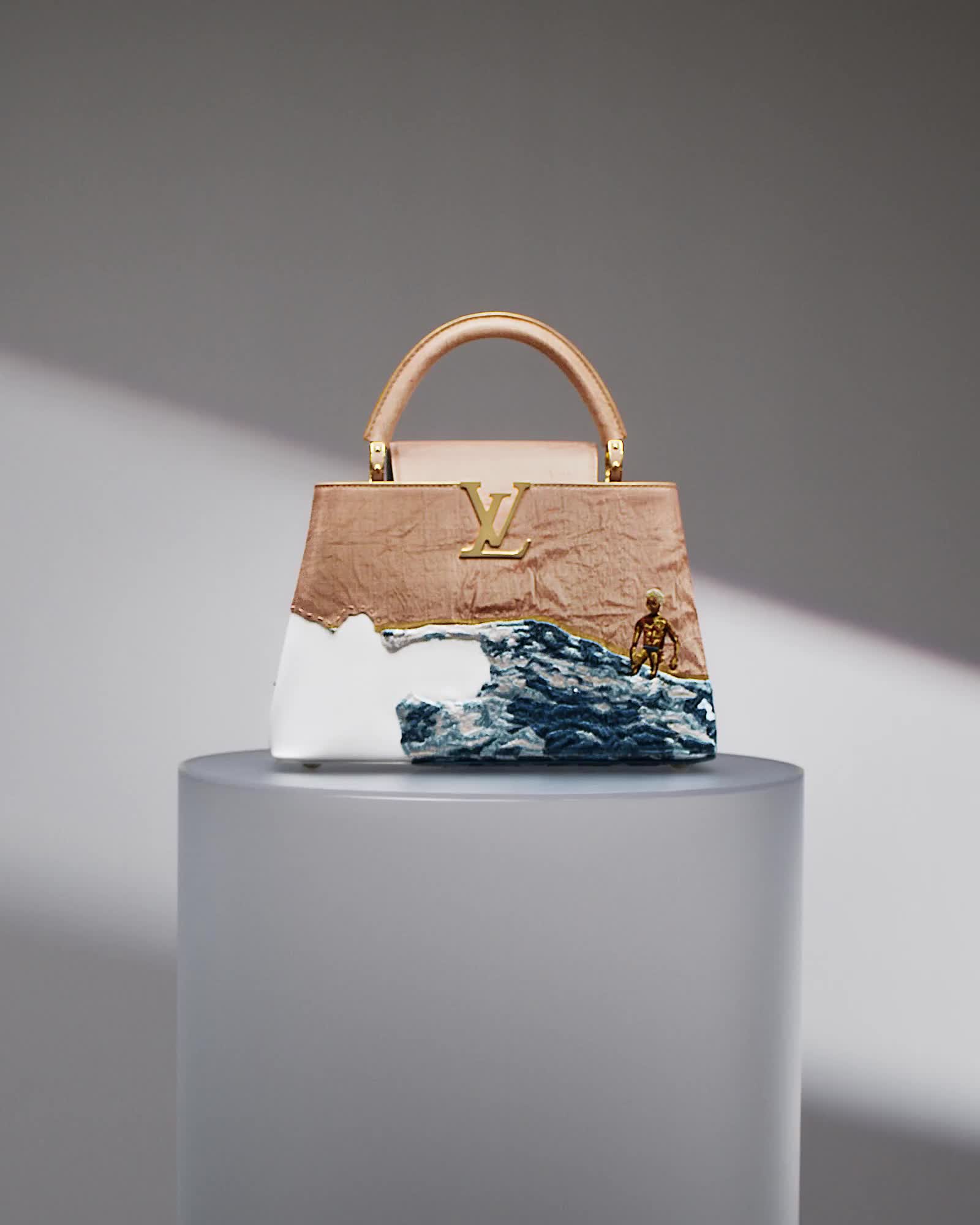 Dalam sebuah perpaduan seni dan mode, kain perca sutra perunggu asli dari Zangewa dipindai dan dicetak dengan definisi tinggi pada bahan leather nan lembut, memanfaatkan kerutan alaminya untuk ditempelkan pada Capucine dengan jahitan yang sengaja dibuat tidak rata. Tema yang berulang pada karyanya, detail emas menguraikan tepi kolam dan berlanjut di sepanjang bagian atas tas, hingga pada bagian LV signature dalam warna metalik. “Saya menyukai tekstur dan bentuk perabaan sehingga berkreasi dengan kain hampir tidak bisa dihindari.” – Billie Zangewa