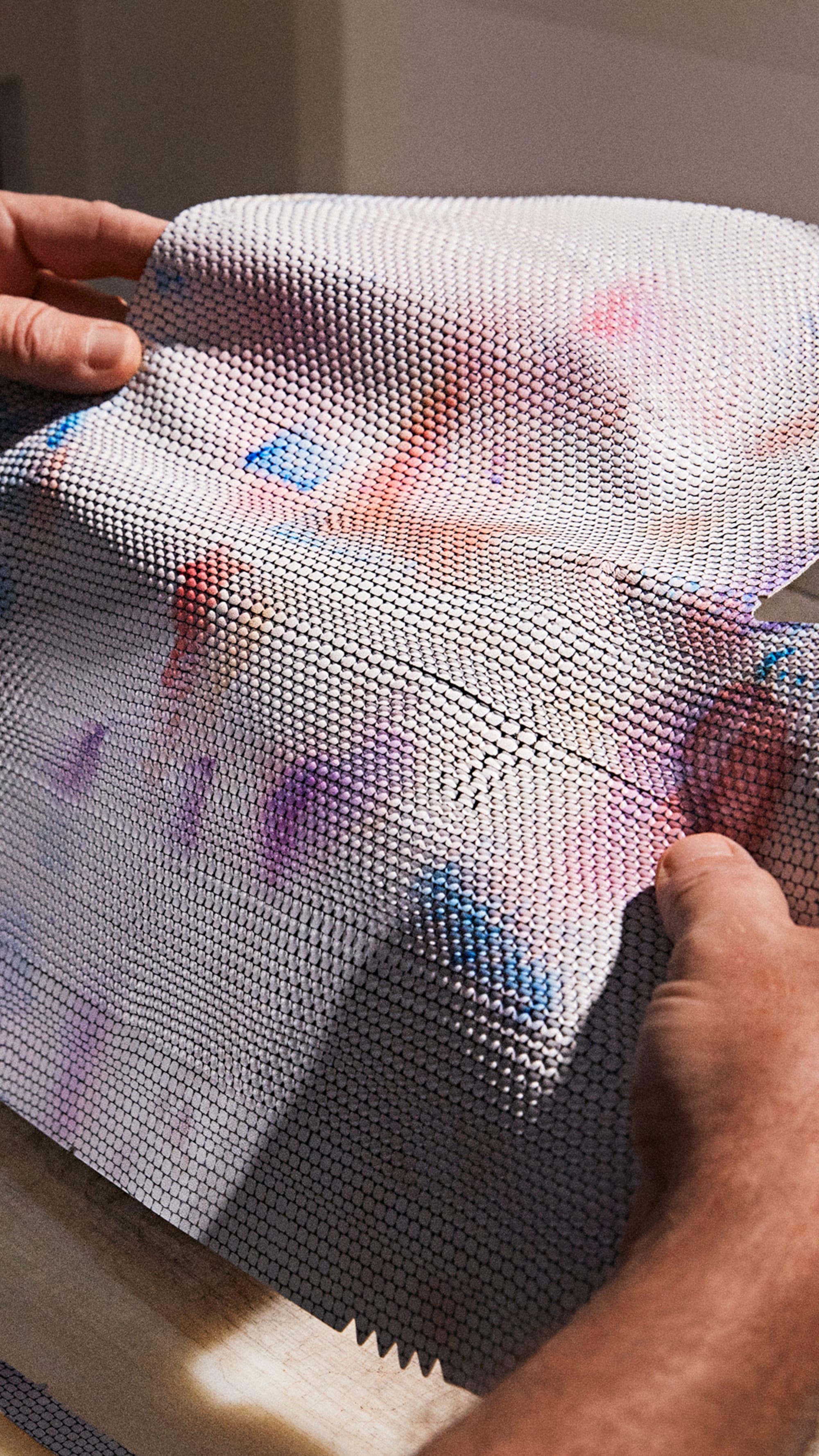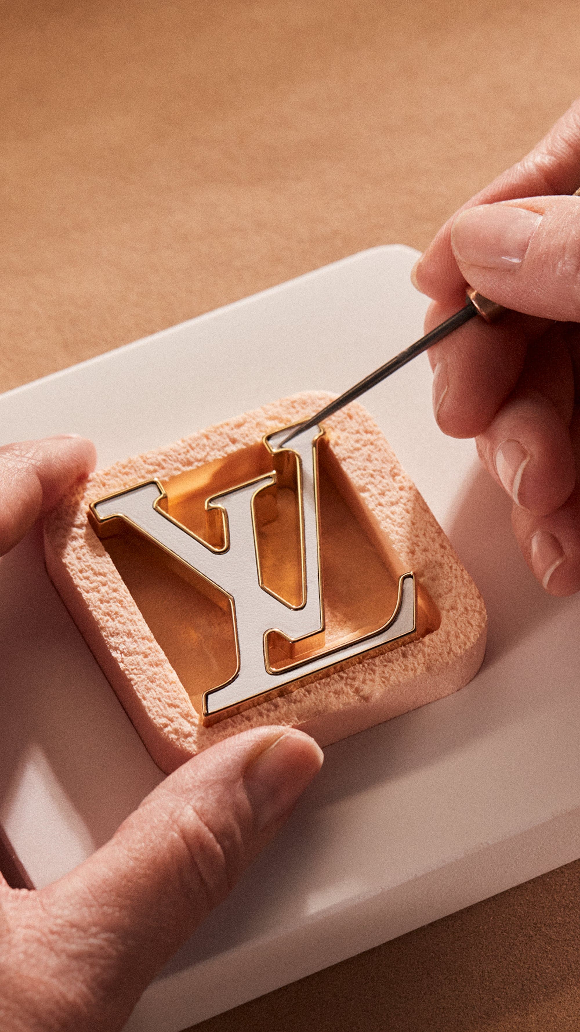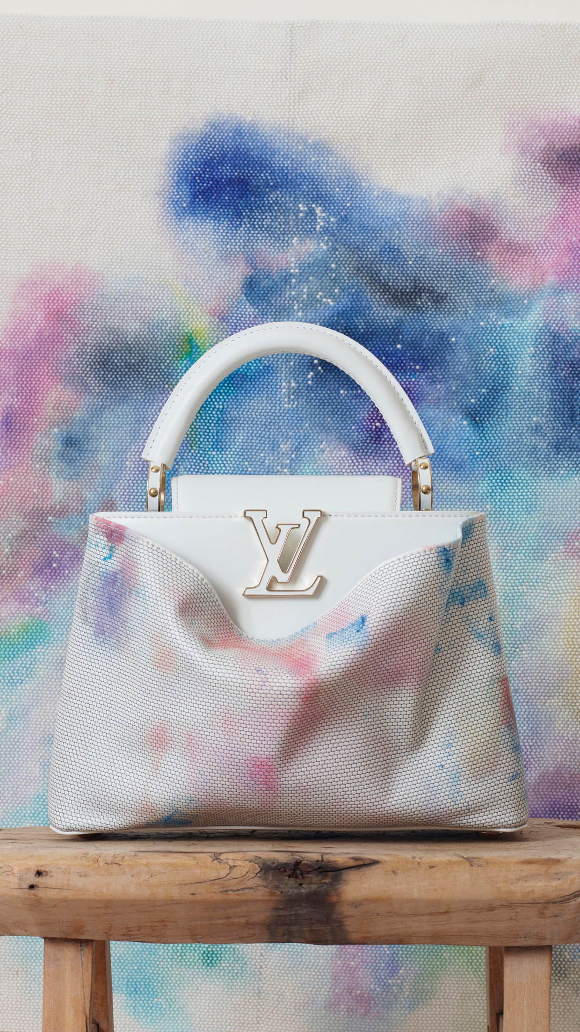 Untuk efek trompe l’oeil, Rumah Mode mengembangkan teknologi baru untuk mengukir pola manik-manik kaca pada kulit yang lentur, membungkus Capucine dengan hati-hati untuk mencerminkan bentuk organik dari karya asli, sekaligus menciptakan kantong eksterior tambahan. “Keahlian konseptual adalah inti dari semua pekerjaan saya. Dengan tim pengrajin di Louis Vuitton, ada kecintaan yang sama terhadap eksperimen dan perhatian yang cermat terhadap detail.” – Lisa Lou